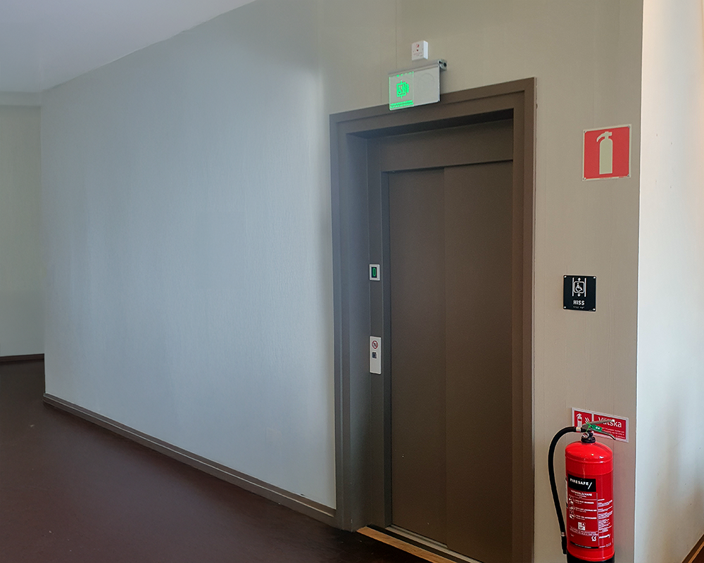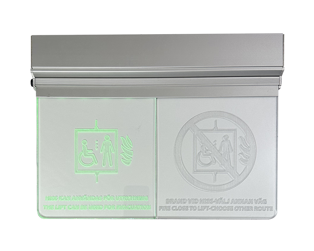 Dynamic elevator sign with aluminum housing and engraved acrylic pictograms. For wall or ceiling mounting. In normal operation, the left side of the sign lights green, and in case of, for example, a fire alarm, the right side lights red to indicate the elevator should not be used. This function is centrally controlled. Suitable for public areas near elevators to clearly indicate whether the elevator is safe to use or if an alternative evacuation route should be taken.