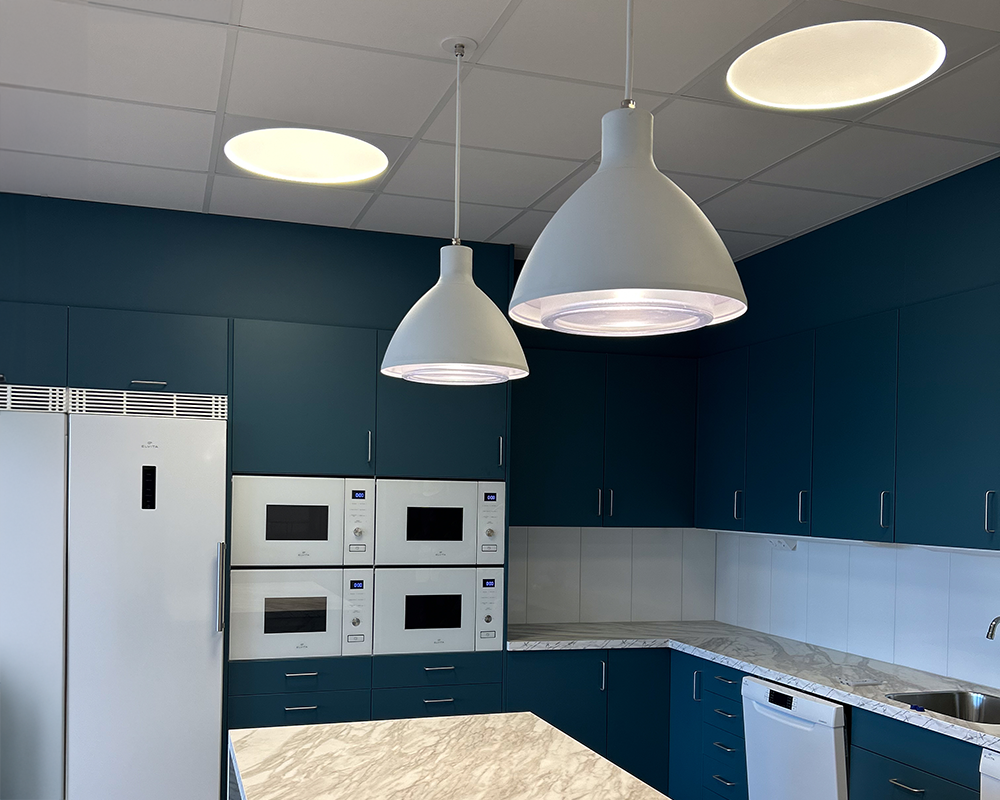Pendelarmatur med avbländat symmetriskt nedljus. Kromaterad och pulverlackerad stomme, bländskydd i PET-G. Armaturen är bestyckad med en utbytbar LED-enhet. För pendelmontage med 2m kabel exkl. stickpropp. Belysning i offentliga lokaler och utomhusmiljöer.