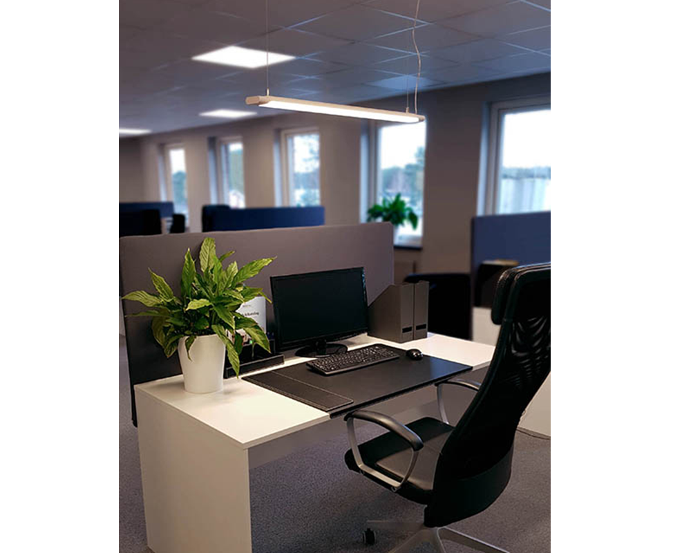 Pendlad LED-armatur med nedljus i vitlackerad aluminium/pc. Ljuset sprids genom ett opalt bländskydd i akryl. Armaturen är dimbar med fram- och bakkantsdimmer. Installeras med medföljande snabbjusterande vajerlås och levereras med 1,5m transparant anslutningskabel 3G 0,75mm² exkl. stickpropp. Passar över arbetsplatser, både i privat och offentlig miljö.