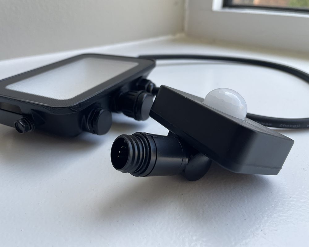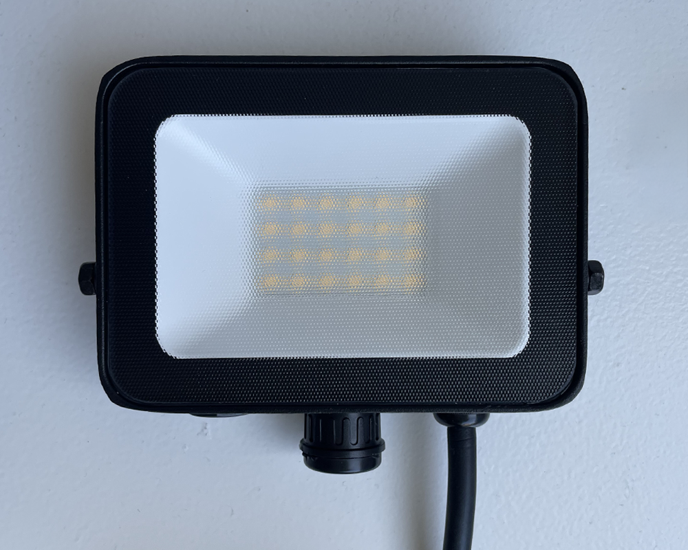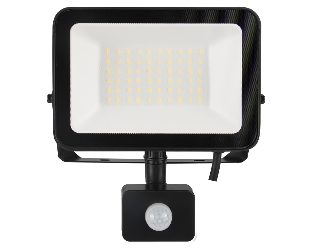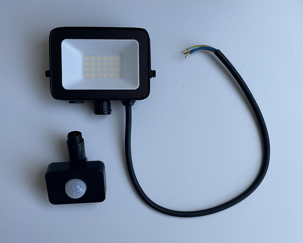 Strålkastare med en stomme i aluminium och bländskydd i härdat ett bländskydd i härdat texturerat glas. Bestyckad med en LED-enhet med inbyggd driver. PIR-sensorn gör det möjligt att ställa in känslighet och tid. PIR-sensorn är justerbar för optimal detektering och kan vid behov enkelt avlägsnas för att möjliggöra användning av armaturen som en traditionell on/off-enhet. Strålkastaren levereras med en gummikabel för enkel installation. Passar för bruk både i privat och offentlig miljö. Tid: 10s-10min, omgivningsljus: <10lux->2000lux